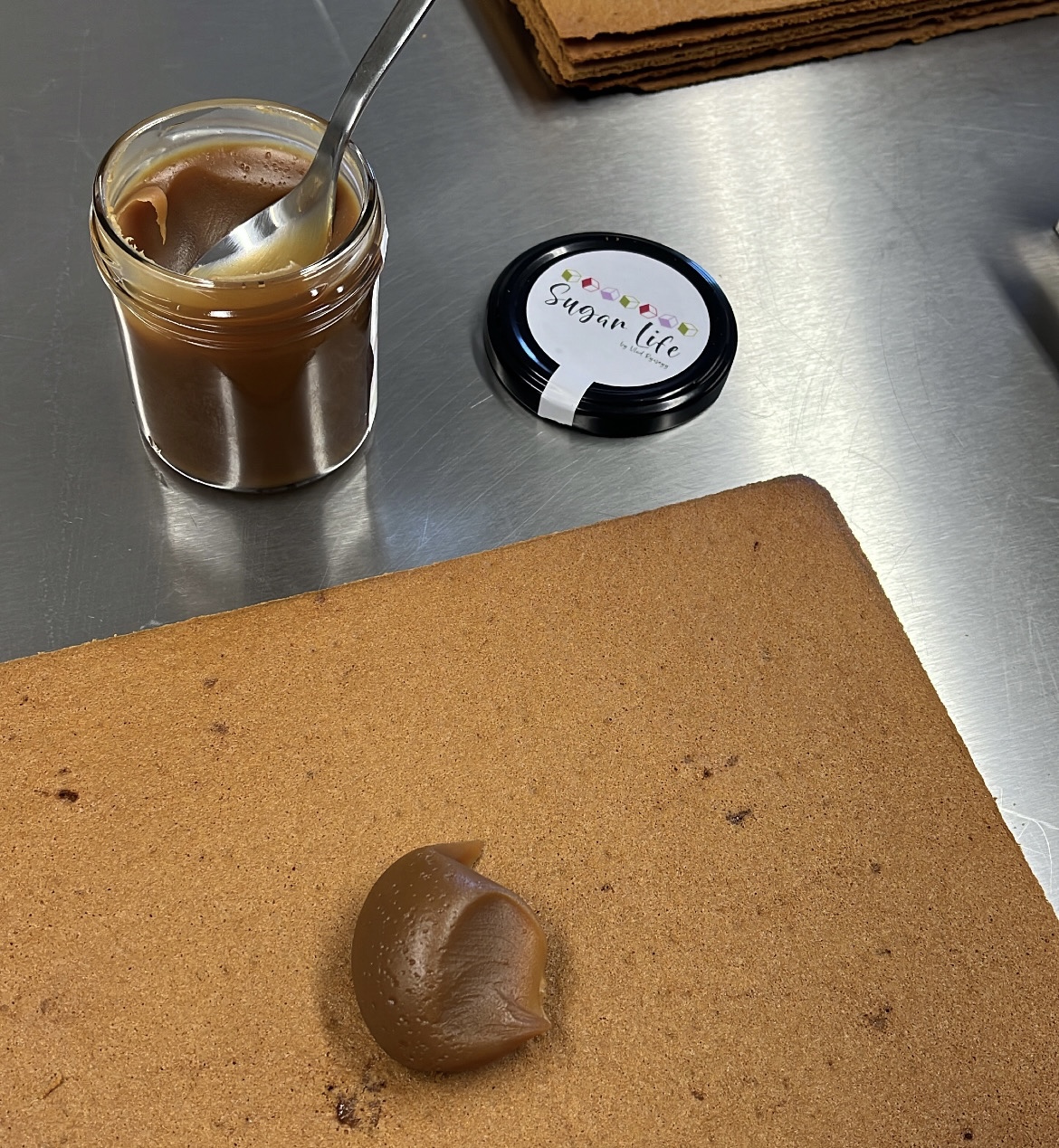 Vykrojené medovníkové pláty potřeme slaným karamel a zarovnáme paletkou do roviny.